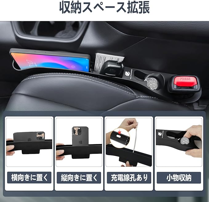 【アップグレード版:小物の落下防止&分類収納&充電線孔あり】アップグレード版として、市場の他製品と比較してさらに使いやすさを向上。従来の隙間クッションは隙間を埋めるだけでしたが、アルファード隙間クッションは収納スペースを拡大し、スマートフォンや財布、鍵、コイン、駐車券、ポイントカードなどをスッキリ整理できるようになりました。また、カード仕切り設計を採用し、カード類も分けて収納可能。底部は深めに作られており、スマートフォンや財布を縦横自在に収納できます。さらに、充電線孔を設計し、充電ケーブルをスムーズに通せる設計で、運転中もスマートフォンを快適に充電できます。コンソール 隙間収納 落下防止としても最適なデザインです。