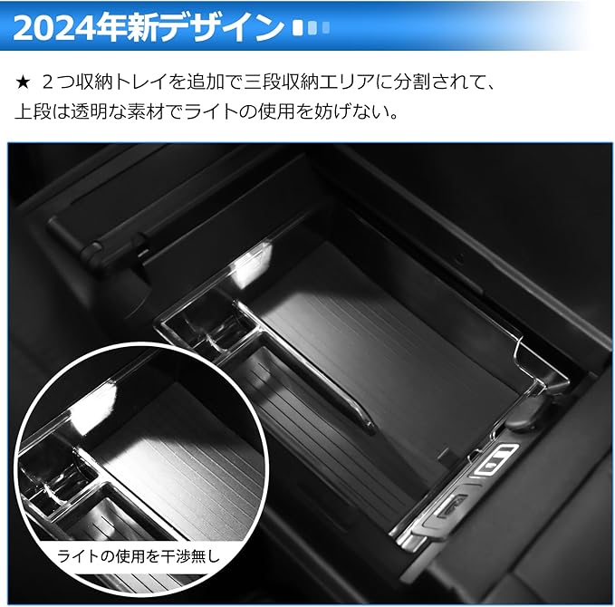 3.【3段構造化】:2つ収納トレイを追加で三段収納エリアに分割されています。また、上層部は透明素材でできて、ライトの使用を妨げない。コイン、携帯電話、カード、鍵、データケーブルなどををスッキリ収納でき、車内をキレイに!