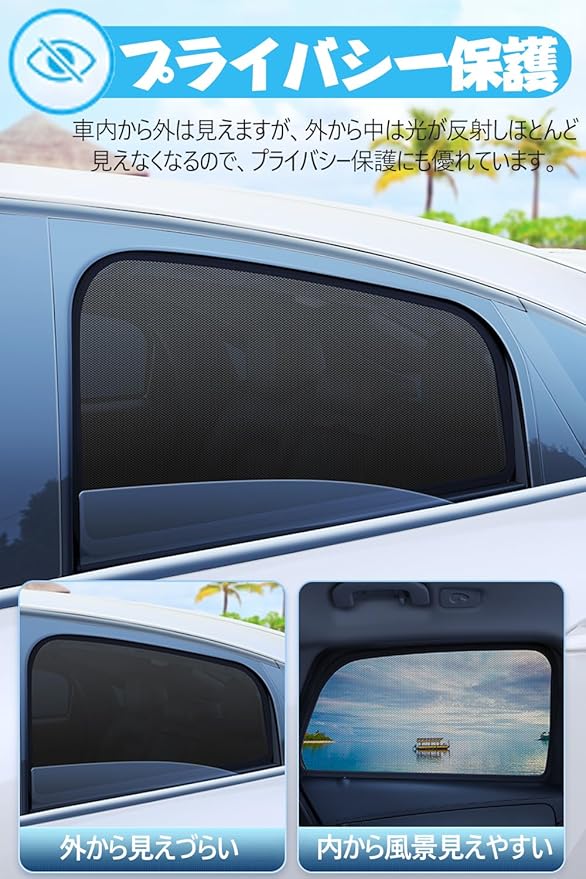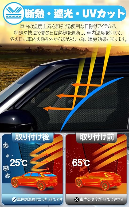 【日除け車網戸】超細いメッシュ穴の設計、光を有効に遮断できます。通気性も良いで駐車しながら冷房と合わせて使用して車内の温度を速くに下げます。遮光、省エネの車用網戸です。