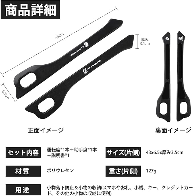 本製品は2本入りで、「運転席+助手席」とも対応可能です。車のシートとコンソールの間に差し込むだけで、小物が落下防止することだけでなく、スマホやお札、小銭、キー、クレジットカード、その他の小物の収納にも便利です。