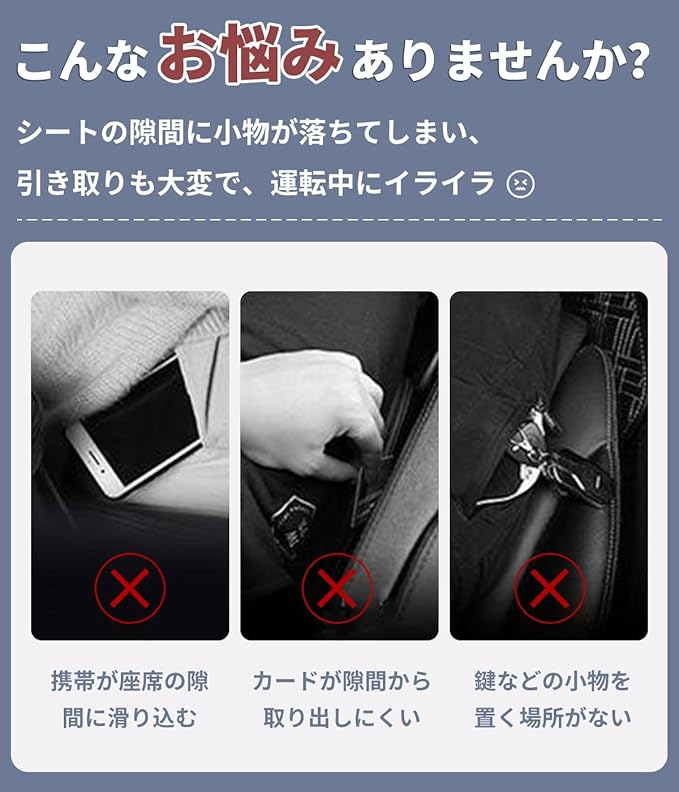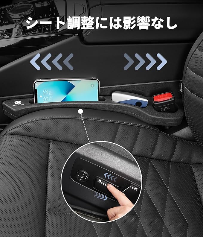 【両面取付可能・落下防止や小物収納】正面で取り付ければ、収納スペースがあるため、小物がシートの隙間に落ちるのを防ぐことができます。そして、スマホやキーなどの小物も保管できます。背面で取り付ければ、小物が落下防止することだけでなく、大きい専用ロゴをはっきりと見ることで、車内の雰囲気が高級感で溢れます!