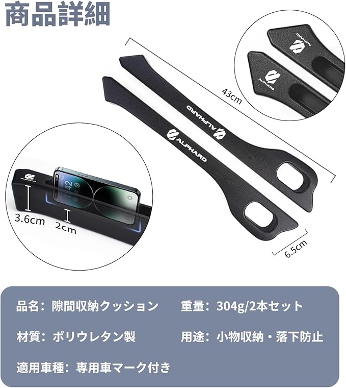 【アルファード 専用】隙間クッション 厚型 ALPHARD 専用ロゴ 隙間埋め 車用 シートサイド クッション アルファード 30系 適用 正・裏面取付可 シート コンソール 隙間収納 落下防止 小物入れ 内装パーツ 運転席+助手席 ロゴ左右対称設計 2本入り (ブラック, アルファード 専用)