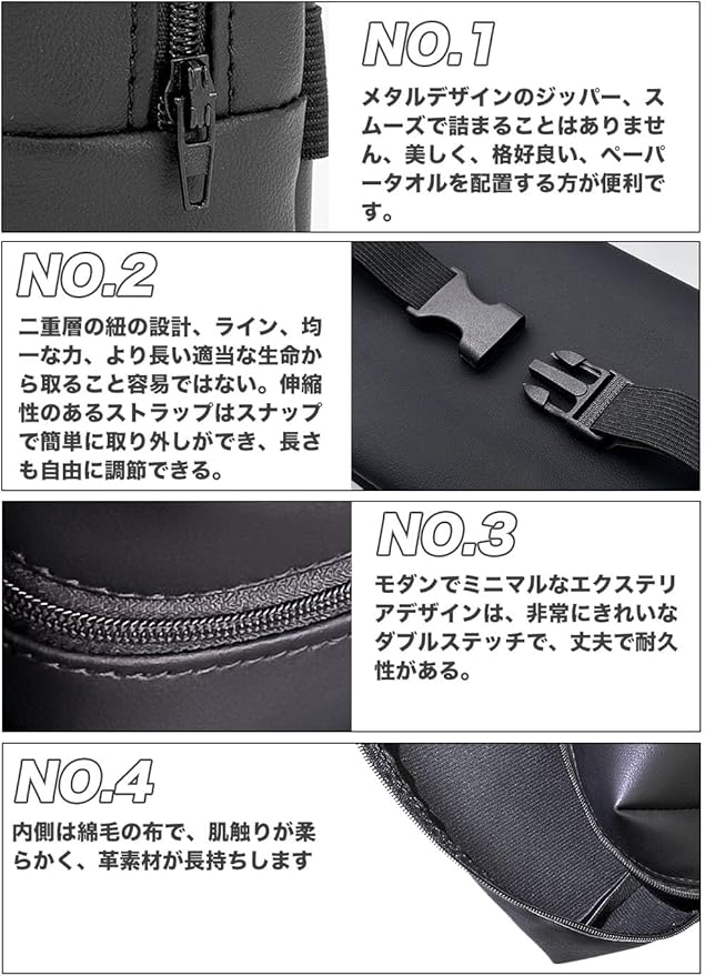 [高品質素材] ティッシュボックスの外側は、ソフトで肌触りの良いレザーを使用しています。 ティッシュボックスの内側にはベルベットを使用し、ティッシュを取り出す際の摩擦を和らげ、ティッシュを傷つけません。 また、ベルベットの吸着性により、ティッシュボックスの中でティッシュが安定し、でこぼこ道でもティッシュがずれにくくなっています。