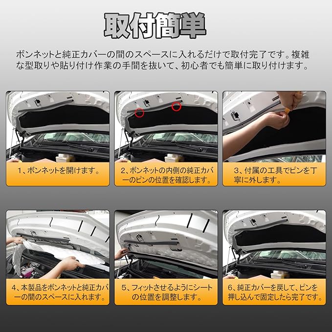 【取付簡単】ボンネットと純正カバーの間のスペースに入れるだけで取付完了です。複雑な型取りや貼り付け作業の手間を抜いて、初心者でも簡単に取り付けます。※取付説明書はございません。商品画像の取付手順をご参考にお取り付けください。予めご了承お願いします。