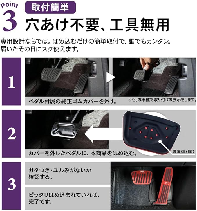 取り付け簡単:ブレーキペダルは純正カバーを取り外してから取り付けます。アクセルペダルは上から下へ直接取り付けます。