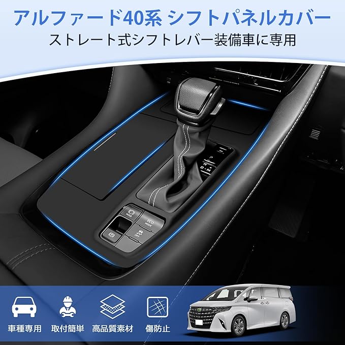 1.【適合車種】:トヨタ 新型 アルファード 40系 ストレート式シフトレバー装備車に専用。年式:2023年6月-現行。ご注意:本製品はヴェルファイアに適合しません。また、年式・グレード等により、シフトレバーの形状では差異がありますので、形状を対照してご確認いただいた上、お買い求めください。