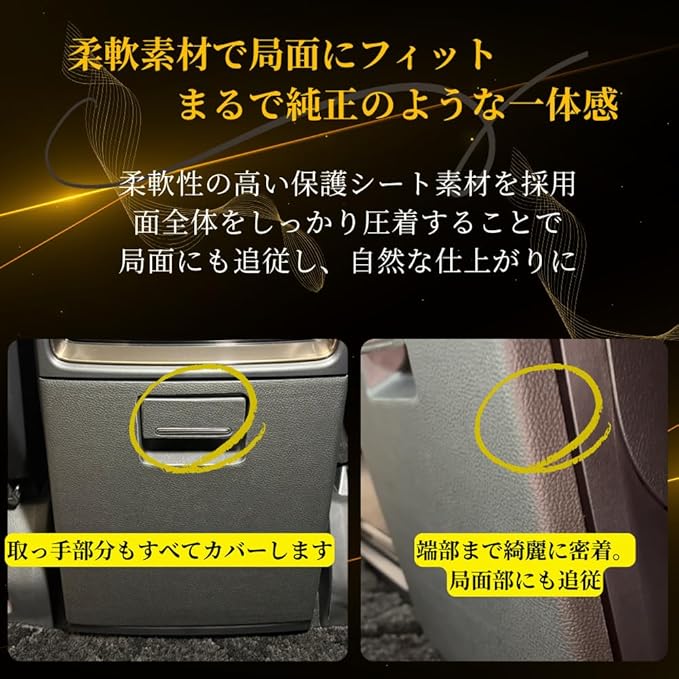 アルファード/ヴェルファイア40系 専用設計のセンターコンソール用キックガード(新改良モデル)です。 後席足元でキズや汚れが付きやすいセンターコンソール部分を、取っ手部分まで含めて全面保護するフルカバー設計。柔軟性の高い素材を使用することで、局面や端部にも自然にフィットし、まるで純正パーツのような一体感のある仕上がりを実現しています。 従来モデルでご要望の多かった「シワが付いた状態で届く」「貼りにくい」といった点を改善し、フラット梱包仕様に変更した新改良版として発売しました。 開封後すぐに貼り付けができ、施工性も向上しています。 カラーは、内装に自然になじむ落ち着いた印象の「ブラック無地タイプ」と、スポーティで存在感のある「カーボン調タイプ」の2種類をご用意。 足元の雰囲気やお好みに合わせてお選びいただけます。 実車にて装着確認を行い、フィット感・見た目・施工性を確認したうえで商品化しています。