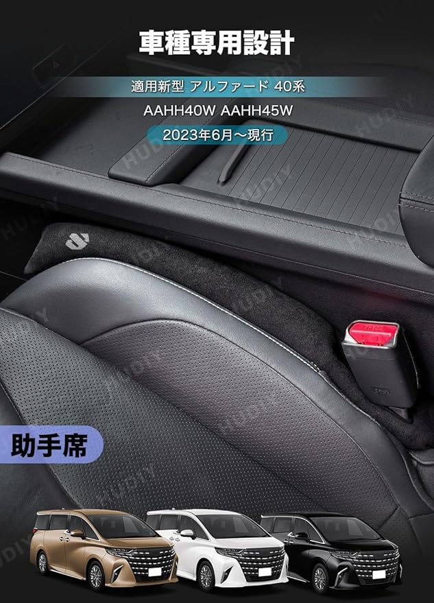 HUDIY(フーディ)車 隙間クッション 新型アルファード 40系 車用 シートサイド隙間埋め ALPHARD 40系 (2023年6月~現行) スエード シートコンソール サイドクッション 一体成形 車用座席漏れ防止ストリップ センター 運転席 助手席 ゴミ小物類 落下防止 プリントロゴ入り小物入れ 2本セット