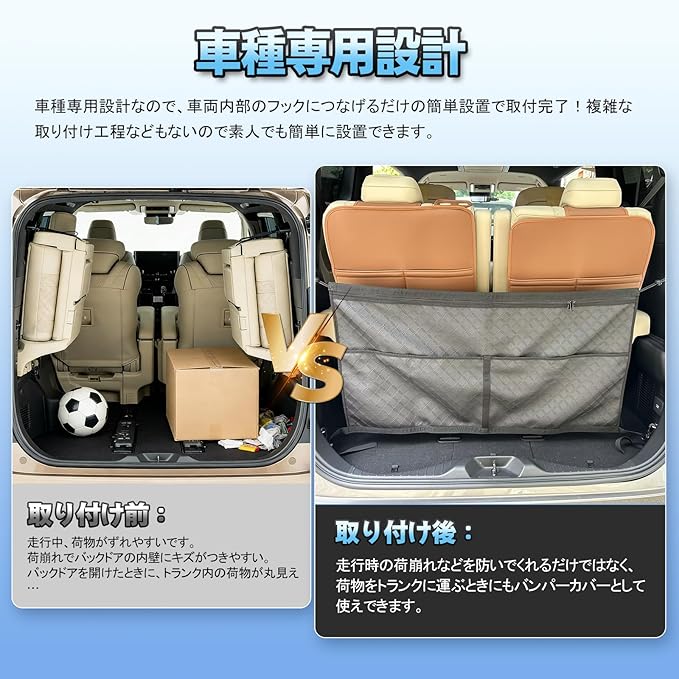 【適合車種】アルファード/ヴェルファイア40系、2023年(令和5年)6月~、アルファード/ヴェルファイア30系、2015年(平成27年)1月~。カラー:ブラック。素材:PVCレザー、オックスフォードクロス。※ラゲッジの左右にフックがない場合には適合できません。ご購入の前に、まずフックの有無をご確認ください。