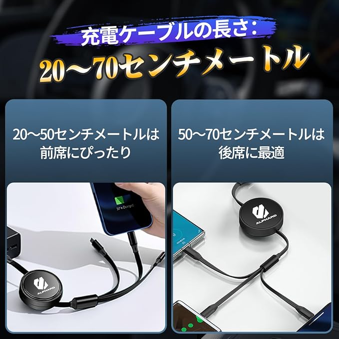 アルファード ALPHARD カー 3-in-1充電ケーブル データケーブル 充電ケーブル 伸縮ャージャー 対応 Alphard 40系 30系 20系 USB&Type-C デュアルインターフェース 対応Android/iPhone/iPad/Type-C データ伝送