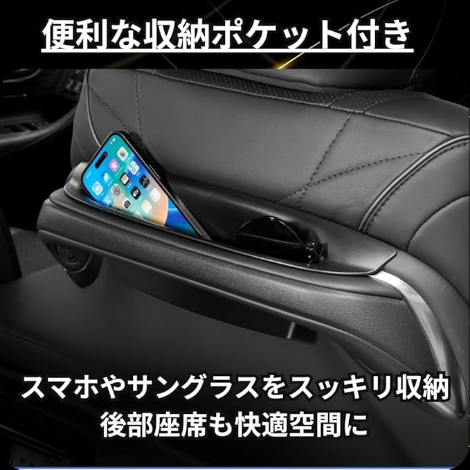 【スマホ・サングラスをすっきり収納】 深さ&奥行きを最適化したポケット形状。最大6.7インチスマホやサングラス、鍵などの小物をまとめて整理。後席の快適度が向上。