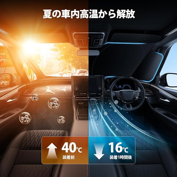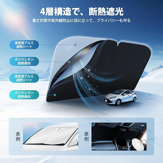 【4層構造】:1層目:高品質高密度アルミ遮熱シート、2層目:ポリウレタン断熱素材、3層目:高品質高密度アルミ遮熱シート、4層目:ポリウレタン断熱素材。高い断熱効果がある素材によって、夏の日で強い日差しを遮断して、車内の温度を減ります。また、紫外線を効果的にカットできます。冬の日で窓からの冷気の浸入を防ぎ、車内温度をキープして車中泊も快適です。エアコンの効率を良くするので省エネになります。従来品よりも遮光性や保温性を大幅にアップし、夏の日を温度下げて、冬の日を温度を上げる効果があります。エアコンの効率を良くするのでエネになります。ブラックメッシュ仕上げ。