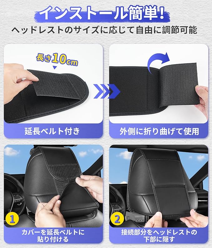 【取り付け・お手入れ簡単】本製品は数秒で簡単取り付け可能なヘッドレストカバーです。ヘッドレストとシートの隙間に通してマジックテープで留めるだけで簡単着脱!運転席、助手席、後部座席(一部分の車種)にお使いいただけます。高級感溢れるの高品質PUレザー製により、汚れや水濡れに強く、お手入れも布で拭くだけで簡単です。