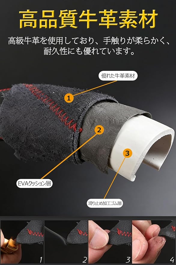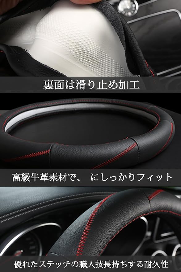 【高品質素材】この車用ハンドルカバーは高品質の耐摩耗性牛革を使用しています、水や汗に強く、異臭もありません。夏はハンドルに手汗がつかないよう防止、冬は冷たい手に対してハンドルが温かく感じます。手にしっかり馴染みフィット感があるのでハンドル操作もラクラクです。長時間の運転で手が疲れないようにしてくれます,オールシーズン対応。