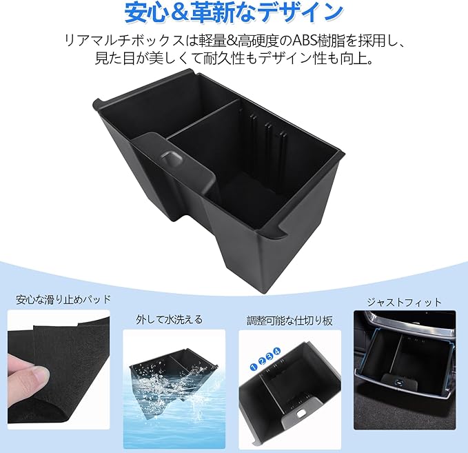 【高品質ABS素材】リヤエンドボックスは軽量かつ耐衝撃性に優れたABS樹脂を採用しており、耐久性があります。見た目もシンプルで高級感があるので、内装をしっかり保護しつつスタイリッシュに仕上がります。また、安心な滑り止めパッドが付属しており、小物がズレにくく、衝撃を吸収して、運転中の騒音や揺れを軽減します。快適なドライブが楽しめます。