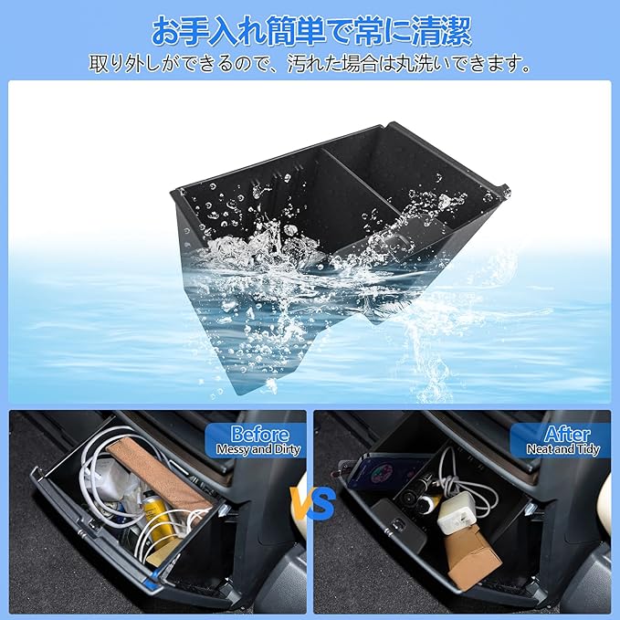 【画期的なデザイン】オープン収納で間仕切りと収納を両立、カオスなアイテムが分けて収納することで、車内の収納スペースアップできるだけでなく、使いたい物をサッと取り出しできます。ABS樹脂製で防水性に優れた、汚れた場合は濡れたタオルを拭くだけで手入れ簡単です。