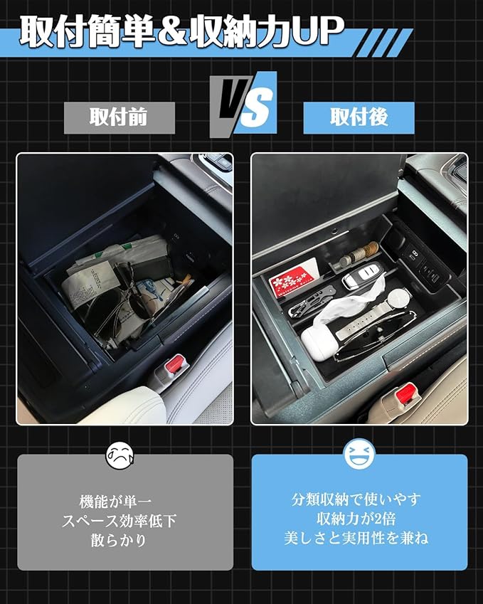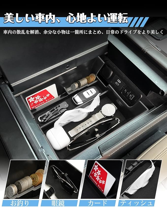 【上質設計&収納力UP】アルファード40系 コンソールトレイは使い勝手を重視し、収納エリアは細かく分類されて、散らかりがちな新型アルファード40系車内も、専用トレイがスッキリ収納できます。40 アルファード/ヴェルファイアの純正コンソールボックスは深くて仕切りもないため中の物が探しづらく、走行中に中身がバラバラ。ヴェルファイア40系 コンソールトレイを置いた後は、下段はティッシュボックスとして利用で、上段カード&鍵や小銭等の小物も見やすく整頓整理、収納力が2倍になります。