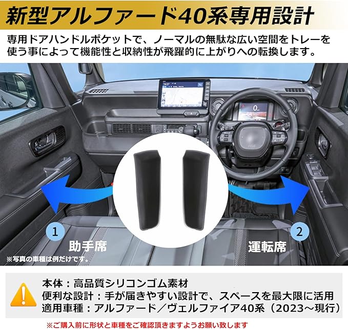 【専用設計】トヨタ専用2023新型アルファード・ヴェルファイア 40系 (2023~現行)への専用ドアポケットで、純正品のように違和感なくピッタリ愛車にフィットします。※年式・グレード・オプション等により適合しない場合が御座います。ご注文の前にご愛車の車種・形状・年式をご確認ください。