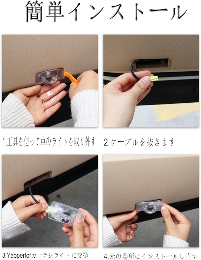 『取り付け簡単』:交換は簡単で、ケーブルがなく、古いドアのランプだけを交換します。ドアを開けると、マークは地上に投影される。注:車両にドア照明がない場合は、ウェルカム ランプを設置することは推奨されません。ご注意ください!