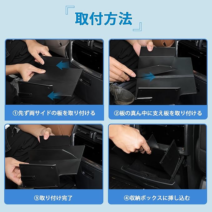 5.【取付簡単】:①先ず両サイドの板を取り付ける。 ②板の真ん中に支え板を取り付ける。③収納ボックスに挿し込みます。もし取付方法が何か不明点がございましたら、アフターサービスまでお気軽にお問い合わせください。