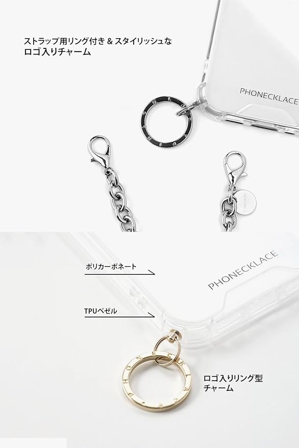 PHONECKLACE「ストラップ用リング付きクリアケース」はチャーム付きで、ストラップやキーチェーンなどの取り付けに適したiPhoneケースです。