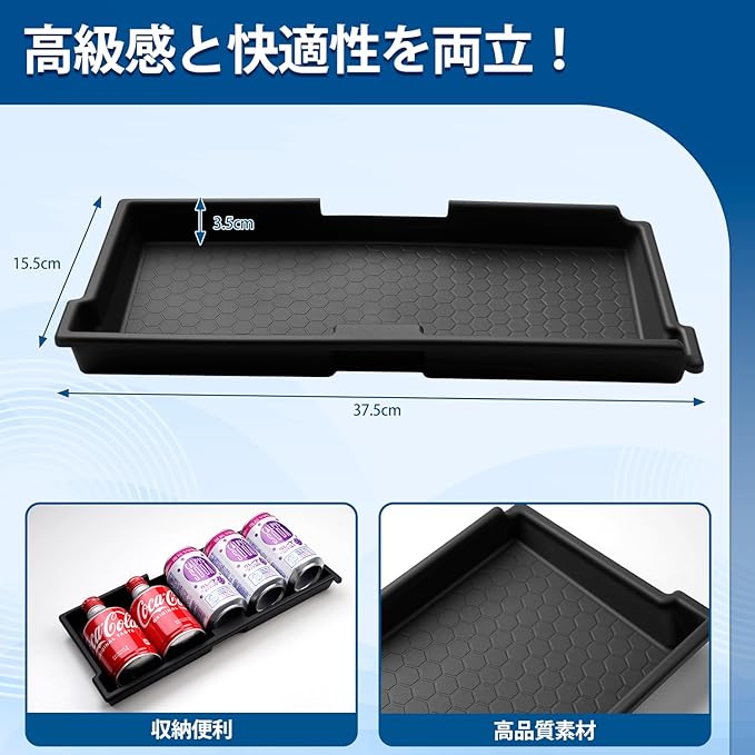 3.【製品仕様】:トレイ本体*1。トレイ本体はTPE素材を採用し、滑りにくく柔軟性があるため、走行中の振動でも小物がガタつきにくい仕様となっております。また、汚れてもサッと拭き取るだけで簡単にお手入れでき、いつでも清潔に保っていただけます。