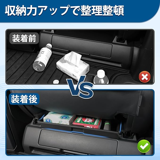 5.【簡単取付】:助手席側下の既存の収納ボックスに置くだけでお手軽に装着し、脱着も簡単です。【ご注意】:付属の両面テープは補助用で、跡が残りにくい仕様となっております。そのため粘着力は強くありません。しっかり固定されたい場合は、市販の強力両面テープをご使用ください。