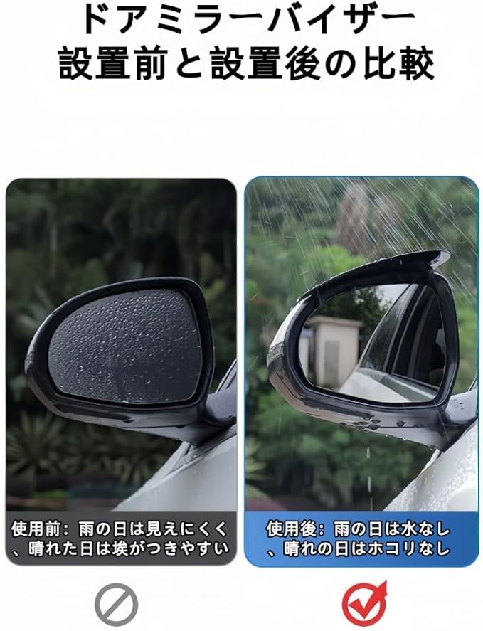 【簡単な取り付け】ドアミラーバイザー 車用は両面テープを貼ったあと、ミラーに挟むだけのシンプルな構造。短時間で取り付けでき、取り外しも簡単です。しばらく放置して、きちんと粘着が安定してから、そのまま使えて、普段の運転にも邪魔になりません。取り外しの場合でも跡を残らず、ご愛車のバックミラー傷けなく、キラキラとした元の状態を保ちながらスクラッチを残りません.