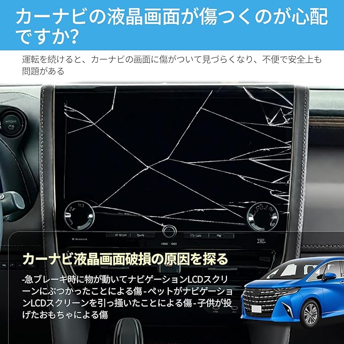 【車種専用の車内液晶画面保護が必要】昨今の自動車の液晶画面の操作が多くなっています、そのため傷や指紋、汚れが気になることでしょう。それで、液晶画面に保護フィルムを貼ったほうが、画面保護にとてもいい対策かと思います。車種専用設計のフィルムはアルファード40 の後席 ディスプレイと、ナビの精確なデータに基づいて作られたので、サイズの事が心配必要ないし、液晶画面を傷から守ると同時に、指紋や汚れが直接オリジナル画面に付くことも防止できます。傷はつかないし、指紋も気になった時に拭けばいいです。