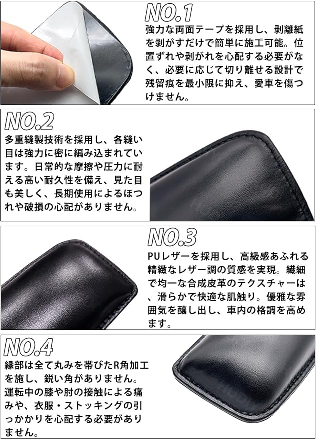 【簡単取り付け】面倒な工具や接着剤は不要。剥離紙を剥がして貼るだけの簡単施工。超強力な両面テープでズレや剥がれを防ぎながら、必要な時は跡残りにくく剥がせますので。センタコンソール側面(膝)、グローブボックス側面(膝)、後部エアコン側面(膝)、ドアアームレスト(肘)、センターアームレスト(肘)の全5箇所に対応。ご自身の運転スタイルに合わせてカスタマイズでき、ご家族全員の快適性を高めます。