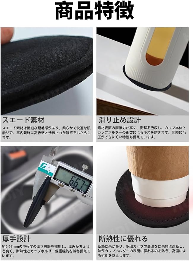 [高摩擦・滑り止め設計 ] 従来の硬質コースターでは、カップが滑りやすく、走行時の振動で音が鳴ることもありました。本品はソフトなスエード表面とクッション性のあるスポンジ層が一体となることで、カップをしっかりホールドするとともに、走行中のわずかな振動や音も低減。カップホルダー周りをより快適で上質な空間に変え、ドライブ中のストレスから解放されます。走行中でもコップが安定し、転倒の心配がありません。