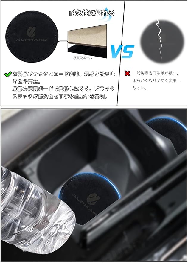 [適合車種] 新型アルファード 40系AAHH40W AAHH45W (2023年6月~現行)。高級スエード素材とステッチングで仕上げられたエッジ、そして専用車種エンブレムをあしらった本品は、車内の細部にまでこだわりたいお客様のための一品です。ご注意ください:一部の車種や年式には対応していない場合がございます。コースターの直径は7.0cmです。ご購入前には、お車のカップホルダーサイズをご確認いただきますようお願いいたします。