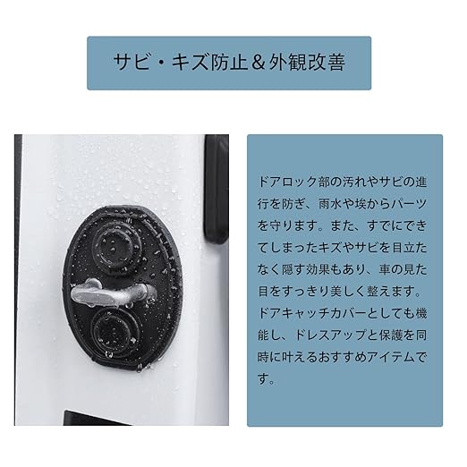 サビ・キズ防止&外観改善: ドアロック部の汚れやサビの進行を防ぎ、雨水や埃からパーツを守ります。また、すでにできてしまったキズやサビを 目立たなく隠す効果もあり、車の見た目をすっきり美しく整えます。ドアキャッチカバーとしても機能し、ドレスアップと保護を同時に叶えるおすすめアイテムです。