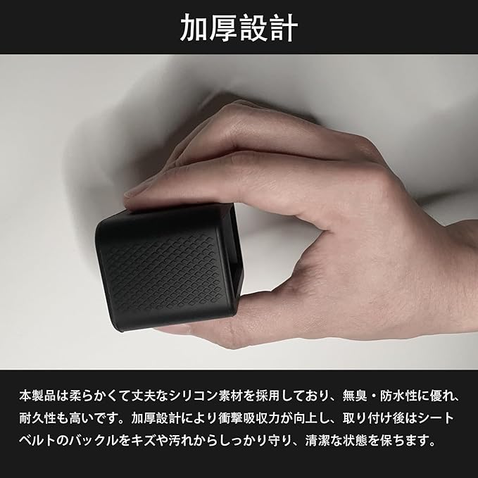 加厚設計:本製品は柔らかくて丈夫なシリコン素材を採用しており、無臭・防水性に優れ、耐久性も高いです。 加厚設計により衝撃吸収力が向上し、取り付け後はシートベルトのバックルをキズや汚れからしっかり守り、清潔な状態を保ちます。