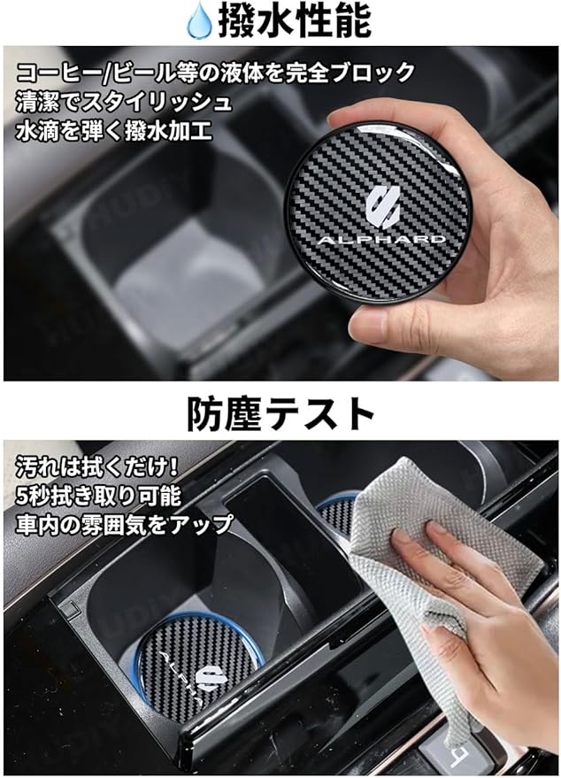 HUDIY(フーディ)アルファード 40系専用 カップコースター車 カーボン調 車載ドリングホルダーコースター 車用ノンスリップ 専用ロゴ 超耐久 ロゴ剥がれ防止 滑り止め 防水 防塵 ロゴ印刷 UV樹脂コーティング 三層構造 車内インテリア プレゼントに 2個セット