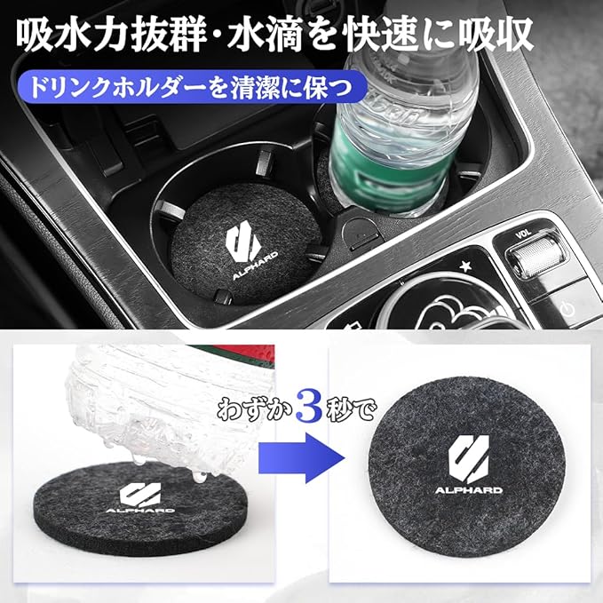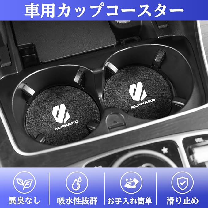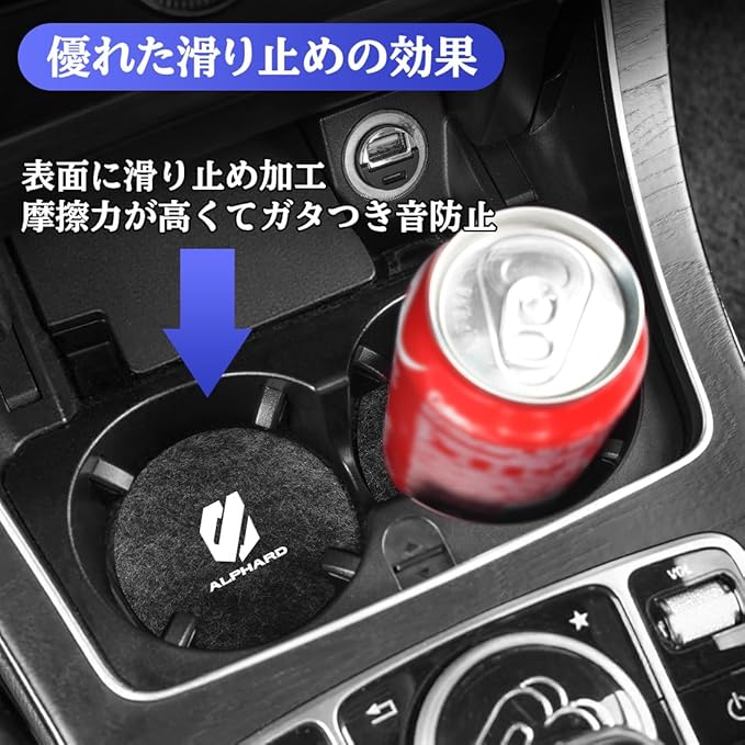 【高級感溢れ 専用ロゴ付き】このドリンクホルダー用コースターは、インテリアの色合いやデザインと自然に調和し、違和感なく愛車の内装に溶け込みます!さらに、この車用コースターの表面には専用ロゴがデザインされており、高級感を引き立て、ユニークな雰囲気と品格を加えます。適用車種:アルファード 20系 30系 40系