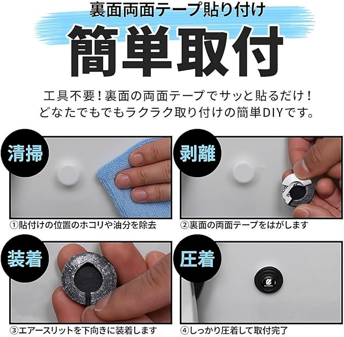 【取り付け方法】ほこりや油分を取り除き、製品の専用両面テープを剥がして、貼り付けだけでの簡単操作、車のフロントバンパーとリアバンパー、および各ドアの側面位置に取り付けることができます。
