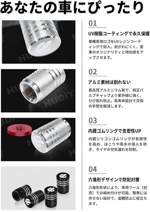 【製品特徴】1. 専用の車両ロゴデザインで、車体全体との完璧な調和を実現。2. 優れた気密構造がエア漏れを効果的に防止し、タイヤ内の空圧を安定維持。3. 走行安全性を高め、タイヤの寿命を延ばし、エア漏れリスクを低減します。4. 愛車の魅力を引き立て、ご自身のこだわりを表現できるとともに、車両全体のグレードを印象付けます。