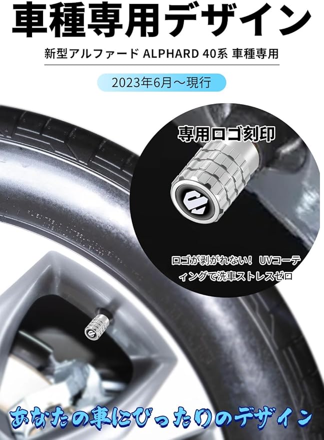 【適合車種】適合アルファード 40系AAHH40W AAHH45W (2023年6月~現行)。アルミ合金製エアバルブキャップは、美しい輝きと優れた耐久性を兼ね備え、タイヤのエア漏れを効果的に防止します。その新しいカラーバリエーションと個性的なデザインは高級感を漂わせ、愛車を保護するとともに、ホイールの美しさを格段に引き上げます。