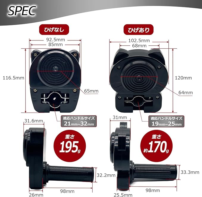 【仕様と注意事項】素材:プラスチック(ブラック)/対応ハンドル径:ひげなしが約21~32mm、ひげありが約19~25mm未満。サイズの詳細は商品画像を参照にしてください。形状・外観に関する検品を行っておりますが、輸入品のため多少の擦れや小傷がある場合があります。音量や鳴り方には個体差があります。