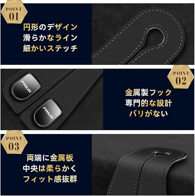 【高品質】プリウス シートフックは、上質なPUレザーで作られており、触り心地が滑らかで柔らかいです。便利なデザインを採用し、先端と末端には頑丈な金属板が内蔵されているため、耐久性に優れています。使用中にロープのようにねじれることがなく、非常に使いやすいです。対応 Prius 60系 50系 40系 30系 20系。