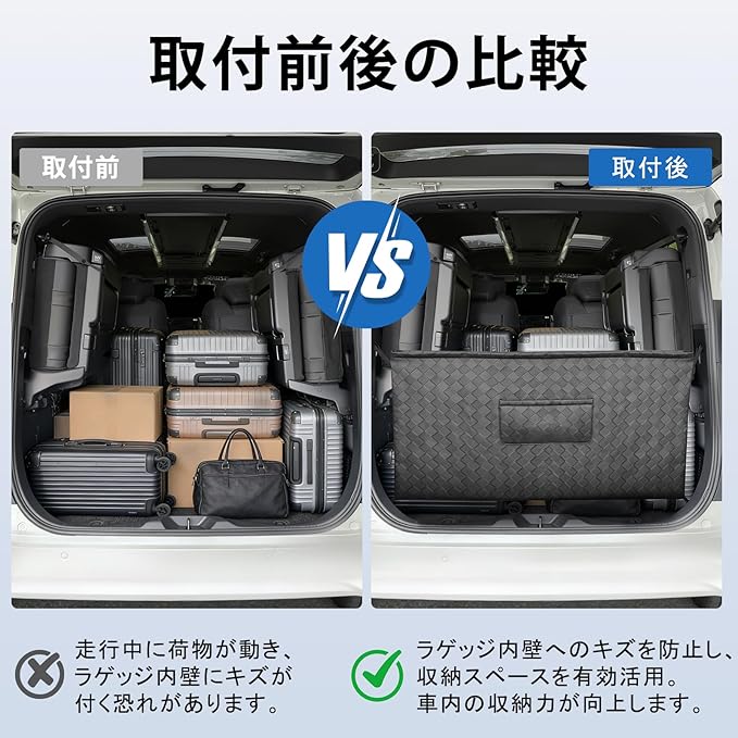 4.【工具不要・簡単取付|初心者でも安心】 取り付けは、収納バッグに付属するカラビナをラゲッジ左右の金属フックに掛けるだけ。工具・加工は一切不要で、初めての方でも短時間で簡単に装着できます。しっかり固定されるため、走行中もズレにくく安心してご使用いただけます。