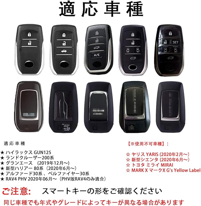 【適合車種】 プリウス 60系 、クラウンスポーツ(2023年10月~)、クラウン クロスオーバー 35系(2022年9月~)、 新型ハリアー 80系(2020年6月~)MXUA80 / MXUA85 / AXUH80/AXUH85 、 ハイラックス GUN125 ランドクルーザー200系 、 RAV4 PHV 2020年06月~(PHV版RAV4のみ適合) グランエース (2019年12月~)、 アルファード ヴェルファイア 30系 前期 2015年(平成27年)1月~ 後期 2018年(平成30年)1月~、アルファード ヴェルファイア 40系、 GRカローラ 、GRヤリス など 【※使用不可車種】:ヤリス YARIS カローラ シエンタ ミライ MIRAI MARK X マークX G's Yellow Label ランドクルーザー300系。使用不可原因:キーの厚さとキー裏面の形状が異なるため、ぴったりフィットしません。
