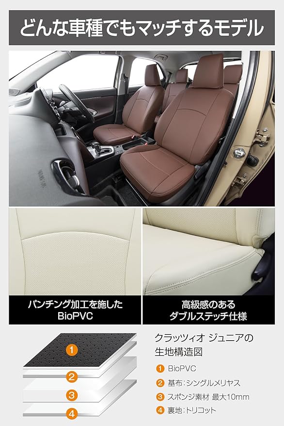 【完全車種別専用設計】3Dスキャナーを用いた車種別専用設計で、張替えのように純正シートにぴったりフィット。【耐汚れ】PVC素材を使用しているため、汚れてもお手入れが簡単。【デザイン】シンプルながらも曲線を取り入れたデザインは幅広い車種に違和感なくマッチするシートカバー
