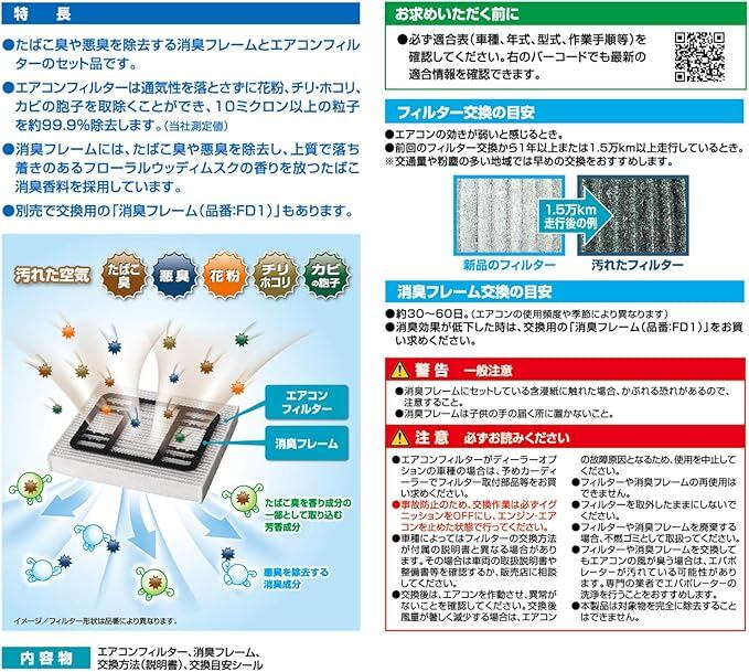 本製品はタバコ臭や悪臭を除去する「消臭フレーム」と、通気性を落とさずに異物を除去するエアコンフィルターのセットです。
