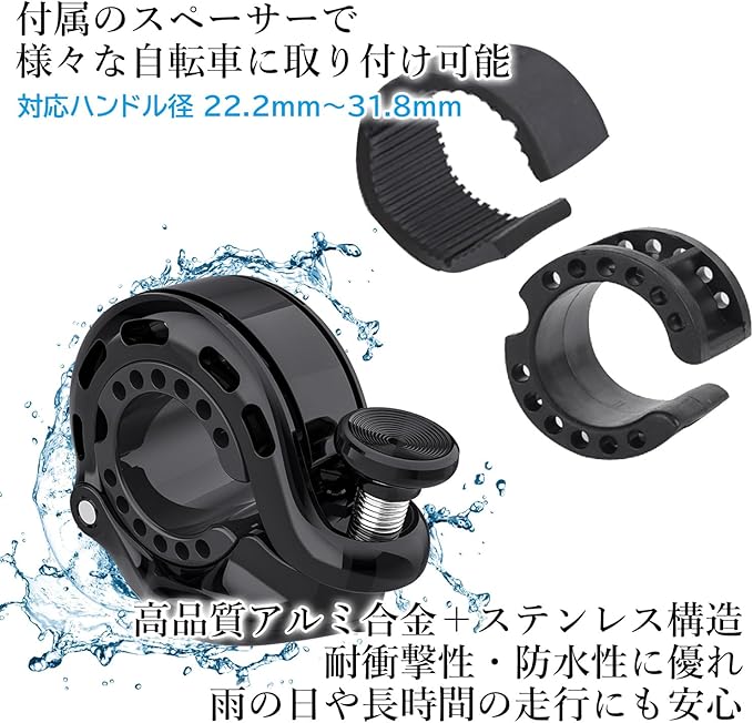 【商品説明】 AirTagを目隠し収納できるサイクルベル。盗難防止&音で安全を守る一体型モデル。AirTag対応の盗難防止機能と実用的なサイクルベルが一体化! スマートで機能的なサイクリングアイテムで、安全と安心を同時に。 ・ベルとAirTagホルダーが一体化 目立たない設計ながら、AirTagを内蔵でき、さらにベル機能も搭載。盗難防止と安全警告の両方を実現。 ・高品質アルミ合金+ステンレス構造 耐衝撃性・防水性に優れ、雨の日や長時間の走行にも安心。 ・AirTagをしっかり固定しながら電波透過も考慮 内部にAirTagをしっかり収納。位置情報の取得に支障を与えません。 ・サイクルベルとしての音量も十分 親指操作でしっかり鳴らせる設計。歩行者や車への注意喚起にも効果的。 ・多くのハンドル径に対応(22.2mm?31.8mm) 付属のスペーサーで様々な自転車に取り付け可能。 ・簡単取付&工具付き 誰でも扱いやすい設計で、取り付けに必要な工具も同梱。 ・カラー:ブラック