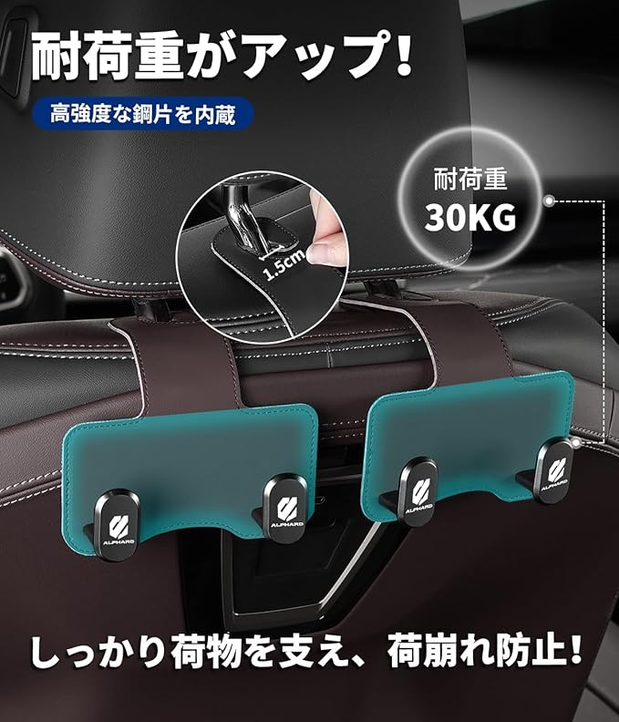【金属板内蔵・耐荷重抜群】やわらかいPUレザーの素材で自由に曲げることができ、また、カーブのデザインで、ほかの車載フックより車シートの形状によりフィットします。さまざまな車種のシートに適しています。自動車の走行中にも良好な安定性を保ち、勝手に動くことはありません。荷重がかかる部分には厚めの金属板が組み込まれておりますので、普通の車用シートフックにより耐荷重が高くおよそ30kgで、安定感にも優れております。