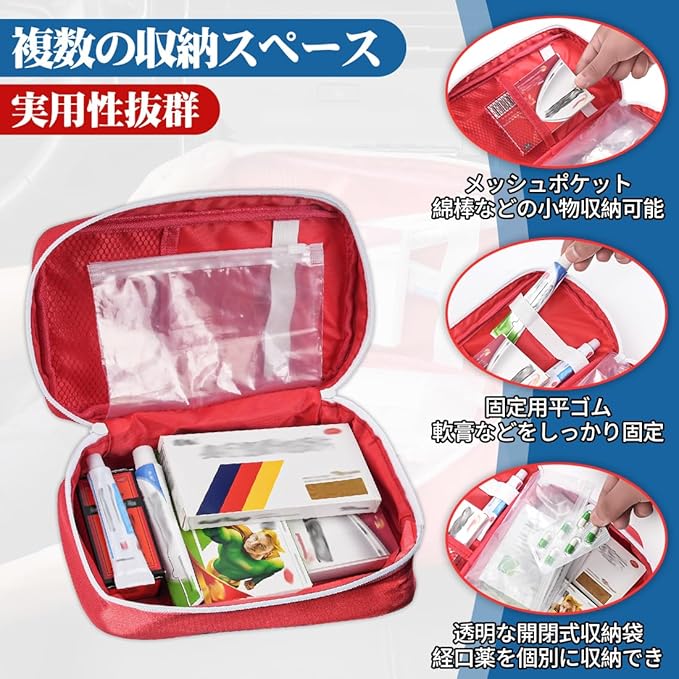 【複数のポケット付き 実用性抜群】このカーメディカルポーチにはメッシュポケットがあり、綿棒やバンドエイドなどの小物を整理して、探しやすくなっています。また、固定用の平ゴムが付いているため、体温計や細長い軟膏などをしっかりと固定できます。さらに、2つの透明な開閉式収納袋が付属しており、経口薬を個別に収納でき、密封デザインで埃や湿気を防ぎます。