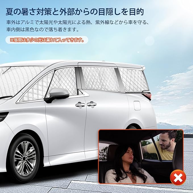 【◆夏の暑さ対策と外部からの目隠しを目的◆】ハンドルやシートやダッシュボードに陽射しが当たっていないのでアチッ的な事もありません。 目隠し効果も、全ウィンドウ共にピッタリ隙間を埋めるので外から車内は見えません。 車内側は黒色なので落ち着きます。車外はアルミで反射効果、車内はシックなブラックで室内を演出します。 ※昼間は多少の光は漏れて入ってきます、予めご了承ください。