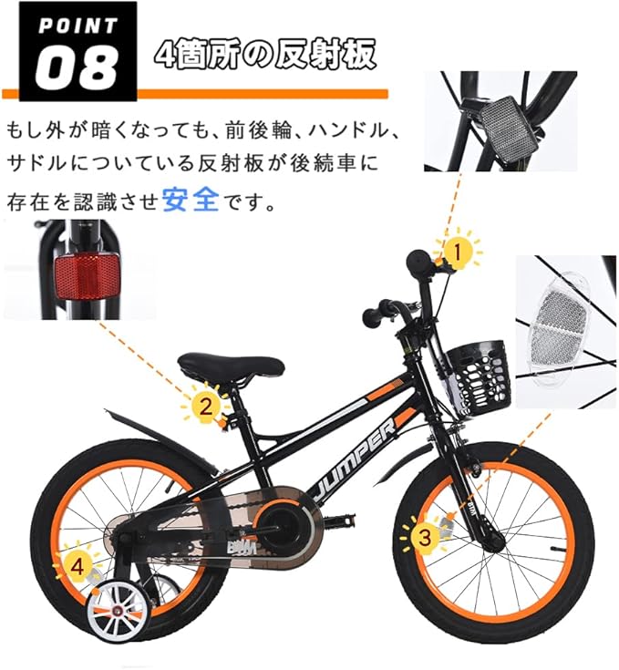 【4箇所の反射板】もし外が暗くなっても、前後輪、ハンドル、サドルについている反射板が後続車に存在を認識させ安全です。